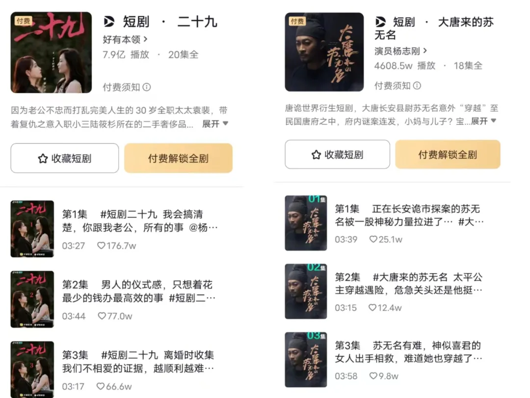 今年初,专业影视机构加码短剧布局后,短剧质量提升,抖音再次尝试了付费模式,短剧《大唐来的苏无名》《二十九》都在剧集进展过半后开启了抖币付费。曾明辉告诉「深响」:目前平台开超前点播,更多是出于测试用户付费潜力和付费转化率的角度作出的选择。从结果来看,《二十九》第一集的点赞数高达176万,《大唐来的苏无名》最高点赞数25万,开启付费之后,《二十九》后四集的点赞数均在一万左右,《大唐来的苏无名》后面七集的平均点赞数在3000左右。单看数量,付费的用户不少,实则付费转化率还有很大的增长空间。