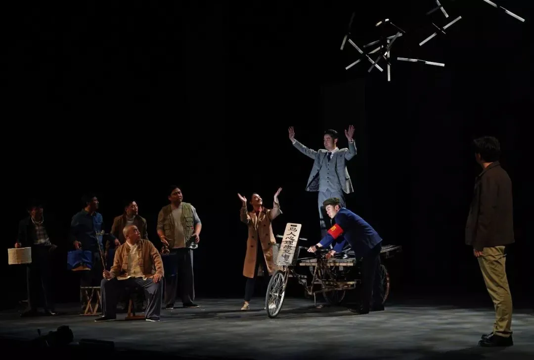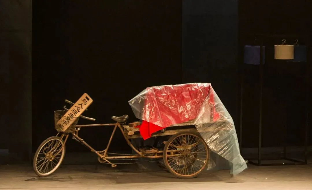 舞台上没有真实的树,没有石桌石凳,布景的设置模糊了年代感,简约的框架幕布,配合巧妙的灯光设计,更加写意,抽离现实的表现手法让整部剧更加具有荒诞性。一辆三轮车随着剧情的发展,是众鸟友中的“鸟市”,珍贵的鸟笼都聚集在此,永远都是鸟人们关注的焦点;是三爷在“鸟人心理康复中心”的专属位置,躺在车上就是床位,与精神分析学家丁保罗展开对话;是断案时的公堂,鸟人们的来言去语引人深思……三轮车成为了一个移动的转台,承载着剧情的起承转合。