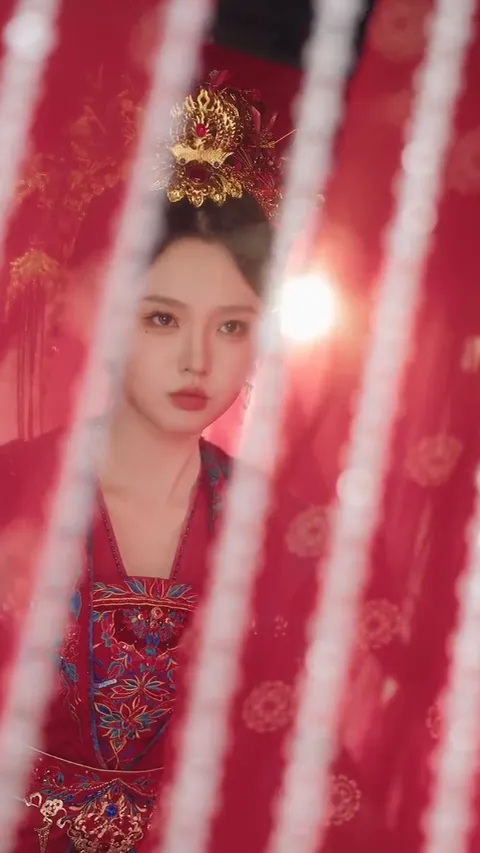 △轿中,头戴凤冠的新娘(沈青瓷前世)轻抚额头。