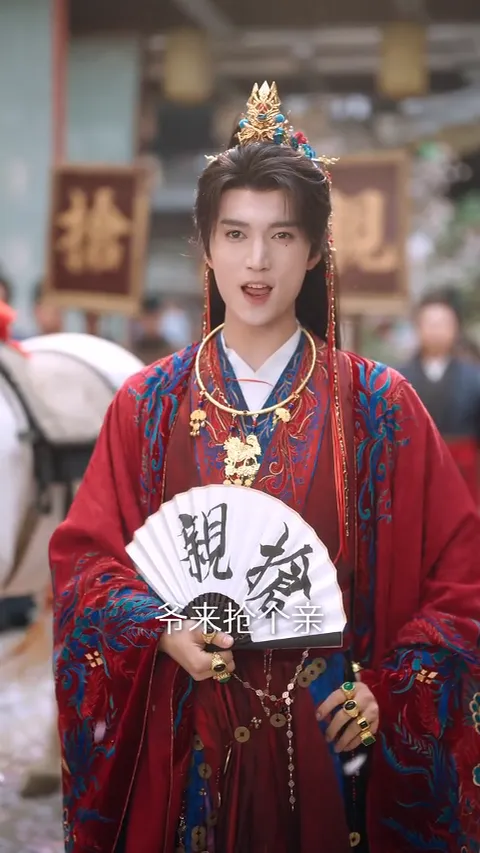 △他展开折扇,扇面上写着“抢亲”两个大字。
