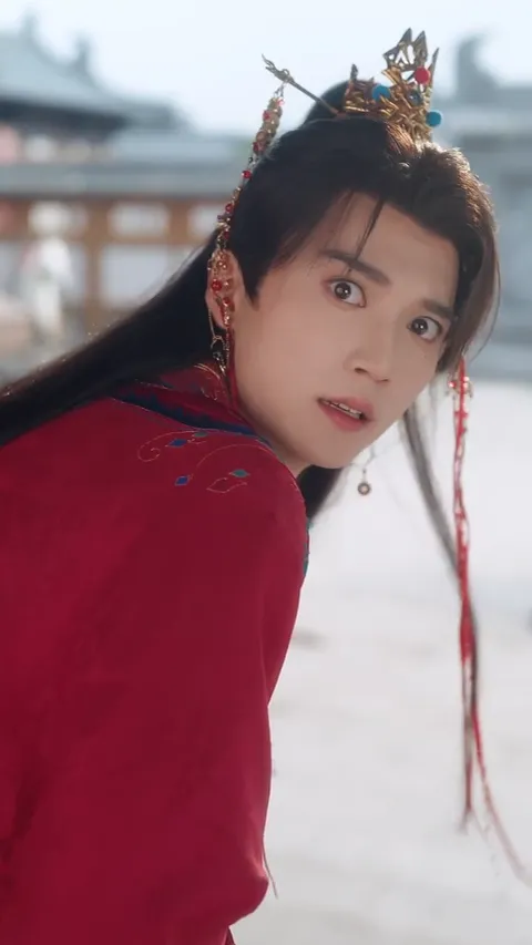 △晏书澜身着华丽红色婚服,头戴金冠,手持折扇。