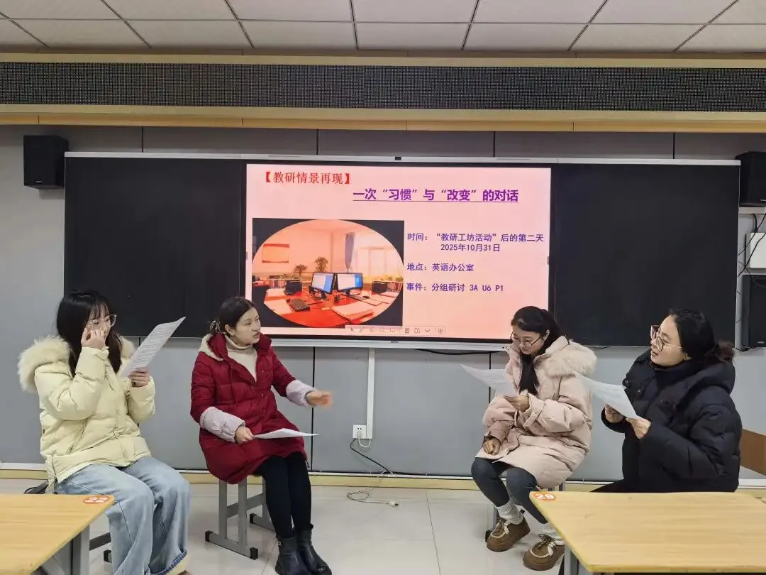 “教师即研究者”的观念在该项目引领教研的行动研究中逐渐深入人心,大家开始积极主动思考,将教学中遇到的问题收集整理,并在日常教研中不断反思和改进。为生动诠释日常教学习惯给新教材实施带来的一些惯性思考,项目组的老师们决定:就从这些“习惯”入手,研究如何实现真正的“改变”。胡玮、刘芳、崔小玲和晋雨晴四位老师主动承担了创意短剧编排任务。