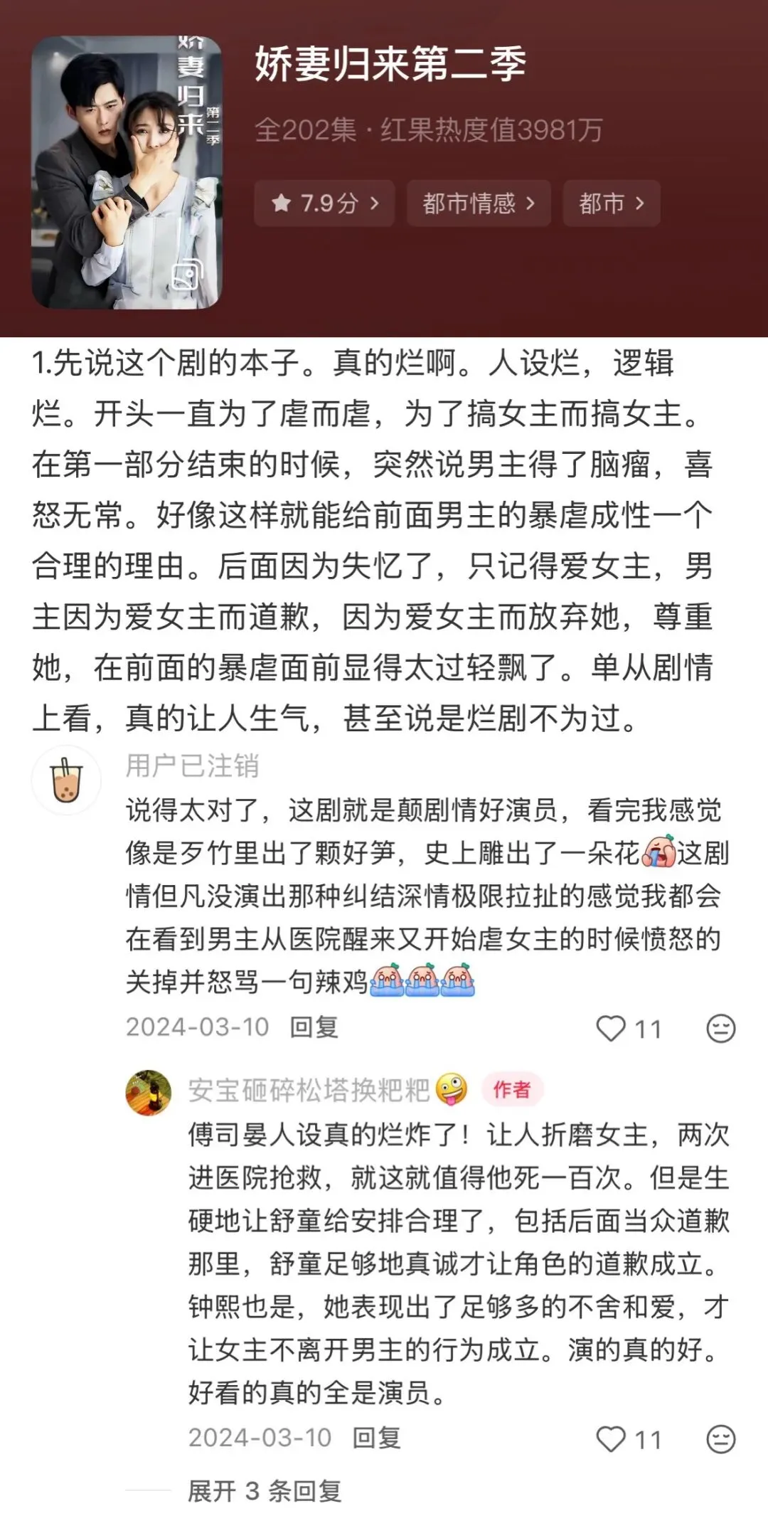 例如早期被尊称为“短剧界甄嬛传”的《娇妻归来》,200集的剧情,集虐女、失忆、追妻火葬场于一身,逻辑烂、人设烂,但在当时短剧圈子依旧是炙手可热。