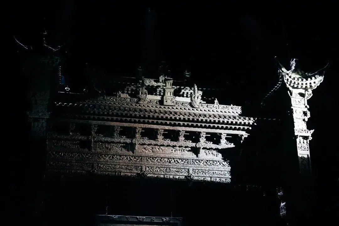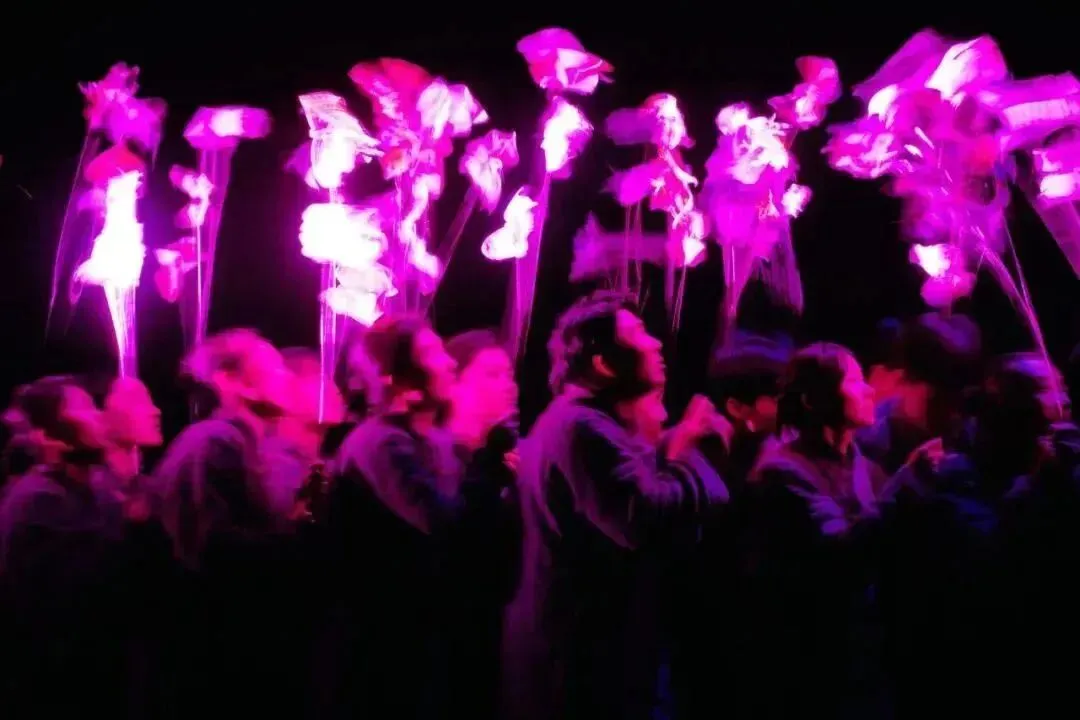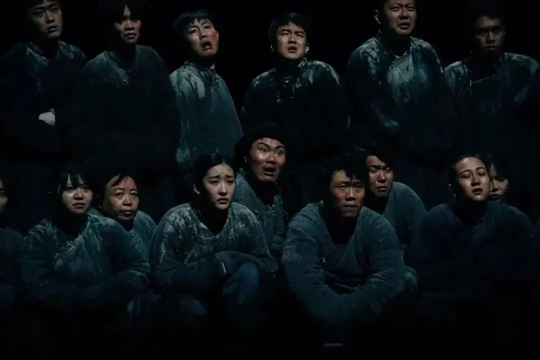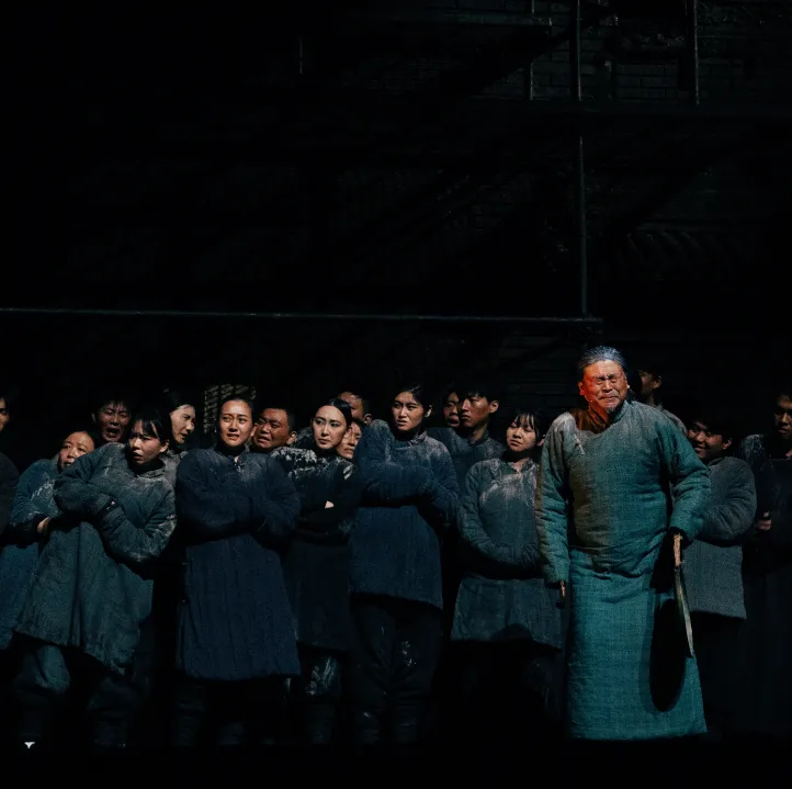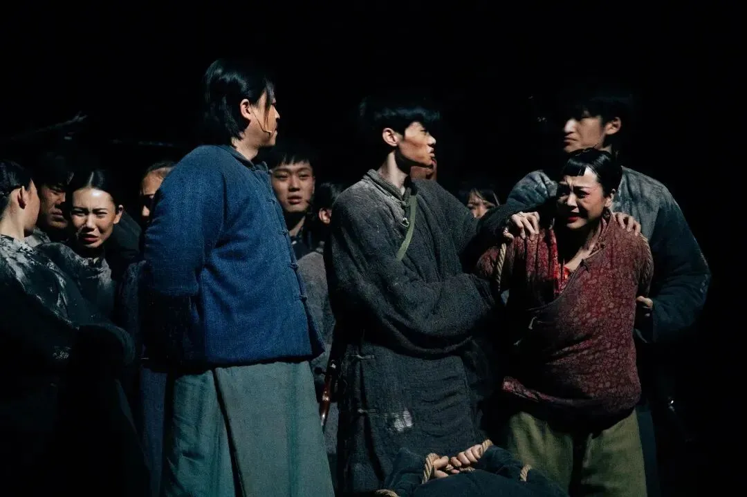 “歌队的意义丰富,他们是可怕的人言,是谁也逃不出的围墙,是集体无意识的外化”。例如,在第四幕结尾,白嘉轩带领众人在祠堂进行拜祖仪式时,歌队演员又作为村民参与拜祖仪式,众人背对观众点燃香火、一齐跪拜、行礼,一片乌压压的人群,透露出一股神秘的信念感,却也有一种莫名的压抑。