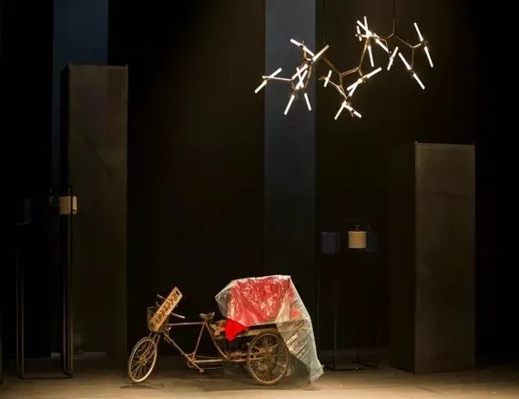 舞台上没有真实的树,没有石桌石凳,布景的设置模糊了年代感,简约的框架幕布,配合巧妙的灯光设计,更加写意,抽离现实的表现手法让整部剧更加具有荒诞性。一辆三轮车随着剧情的发展,是众鸟友中的"鸟市",珍贵的鸟笼都聚集在此,永远都是鸟人们关注的焦点;是三爷在"鸟人心理康复中心"的专属位置,躺在车上就是床位,与精神分析学家丁保罗展开对话;是断案时的公堂,鸟人们的来言去语引人深思……三轮车成为了一个移动的转台,承载着剧情的起承转合。