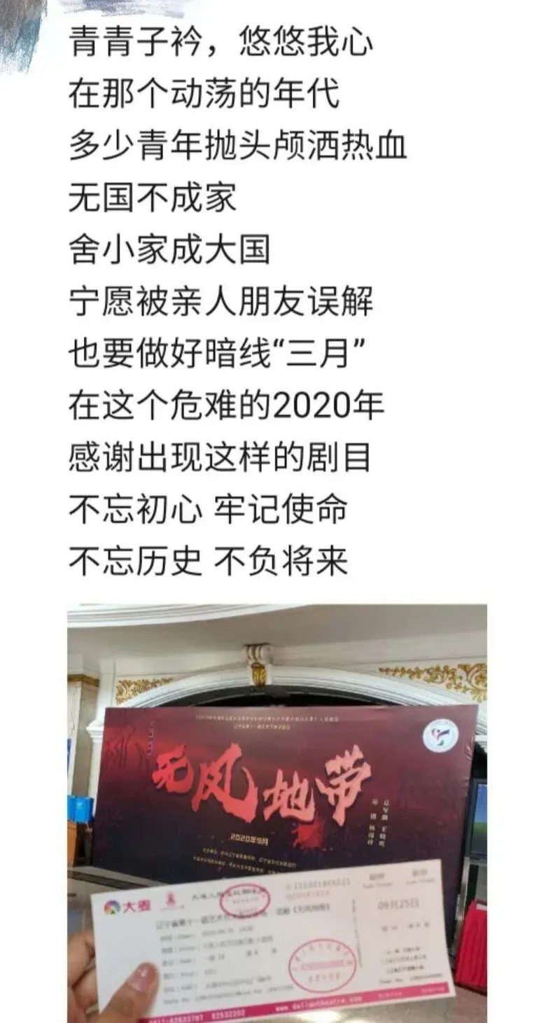 大型原创话剧《无风地带》自9月25日在人民文化俱乐部上演以来,以其跌宕的剧情脉络、悲壮的人物命运、崇高的理想信念、满腔的家国情怀深深打动了现场每一位观众,很多观众饱含着热泪看完了演出,无不被演员深厚的台词功底、气势磅礴的主题音乐、剧中剧、梦中剧场景切换的巧妙设计所吸引……纷纷表示在国庆节前夕能看到这样一部充满正能量的本地原创大戏而一饱眼福!