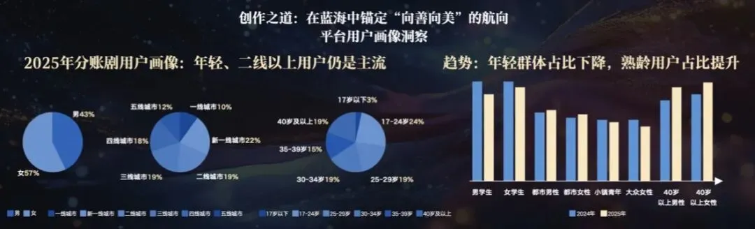 从用户画像来看,年轻、高线城市用户依然是腾讯视频短剧的核心用户群体,这部分用户具有较高的审美水平和内容需求,对精品内容的接受度和付费意愿较强。同时,一个显著的趋势是,40岁以上用户的占比正在稳步提升,2025年相比于2024年,40岁以上用户占比提升了8个百分点,这意味着短剧市场正在向更广泛的圈层拓展,用户对题材广度与表达深度的需求日益多元。针对这一趋势,腾讯视频鼓励创作者挖掘适合熟龄用户的内容题材,推出具有时代感、人文性的作品,满足不同年龄圈层用户的内容需求。